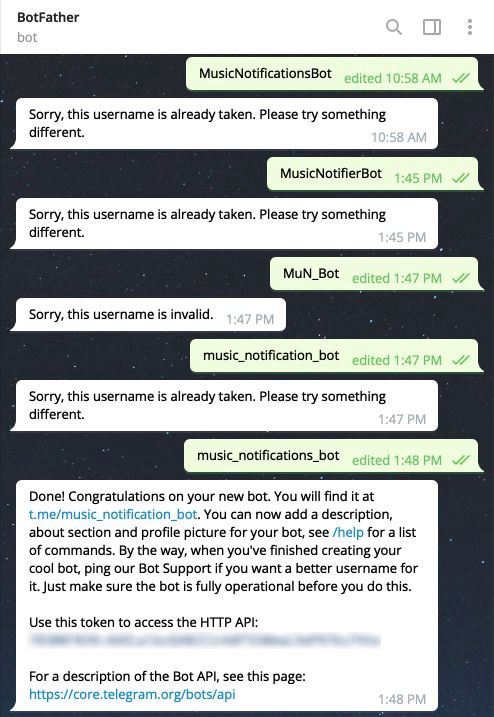 Unless you intend this to be a public bot the name doesn t really matter. Choose a name for your new bot. Telegram bot creation is a novel process because much of it is centered around your own interactions with a telegram bot. It will let you create a telegram bot.